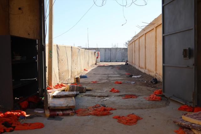 Terör örgütünce serbest bırakılan DEAŞ mensuplarının, tutuklulara giydirilen ve kaçarken çıkardıkları turuncu elbiseleri hapishanenin çevresine attığı görülüyor.
