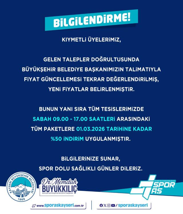 Kayseri Haberleri - Kayseri Büyükşehir Belediyesi’ne bağlı Spor AŞ tesislerinde uygulanan yüksek fiyat tarifeleri, kamuoyunda ve yerel basında geniş yankı uyandırmıştı. Yapılan haberlerin ardından belediye geri adım attı.